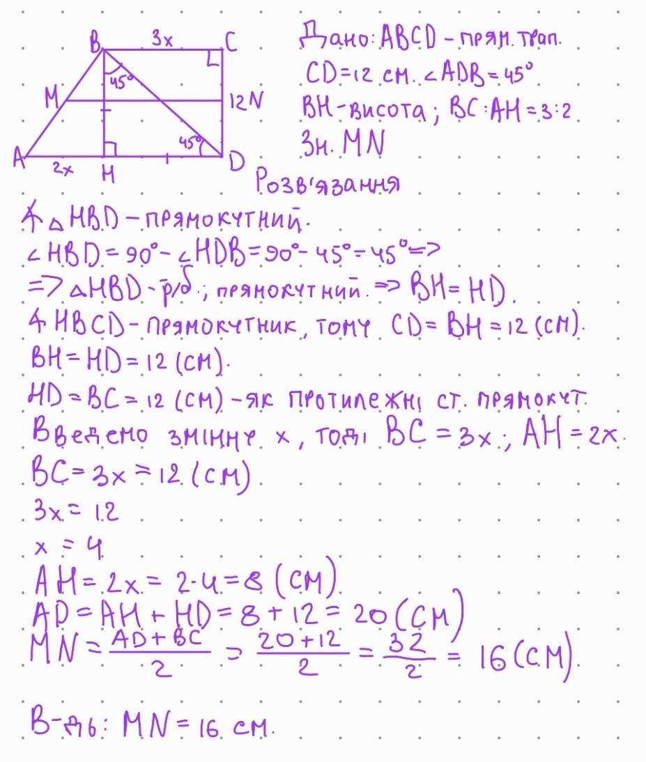 CD = 12 см, угол ADB=45°,BH - высота, ВС:АН = 3:2.