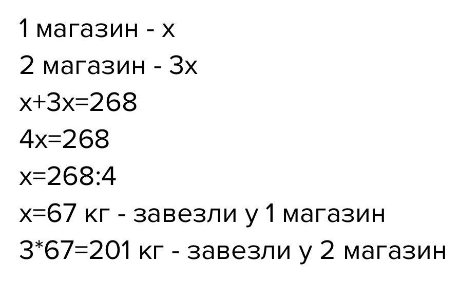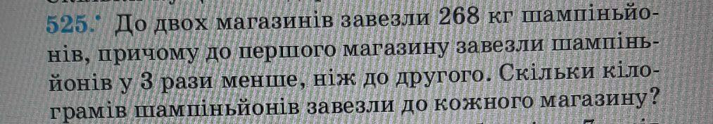 Таким чином, до другого магазину завезли 201 кг шампіньйонів, а до першого магазину завезли 3 рази менше, тобто (201 / 3) = 67 кг шампіньйонів.