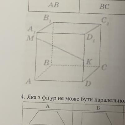 3. На рисунку зображено куб АВCDA1B1C1D1. На якій прямій лежить точка перетину прямої МК i площини ABC?