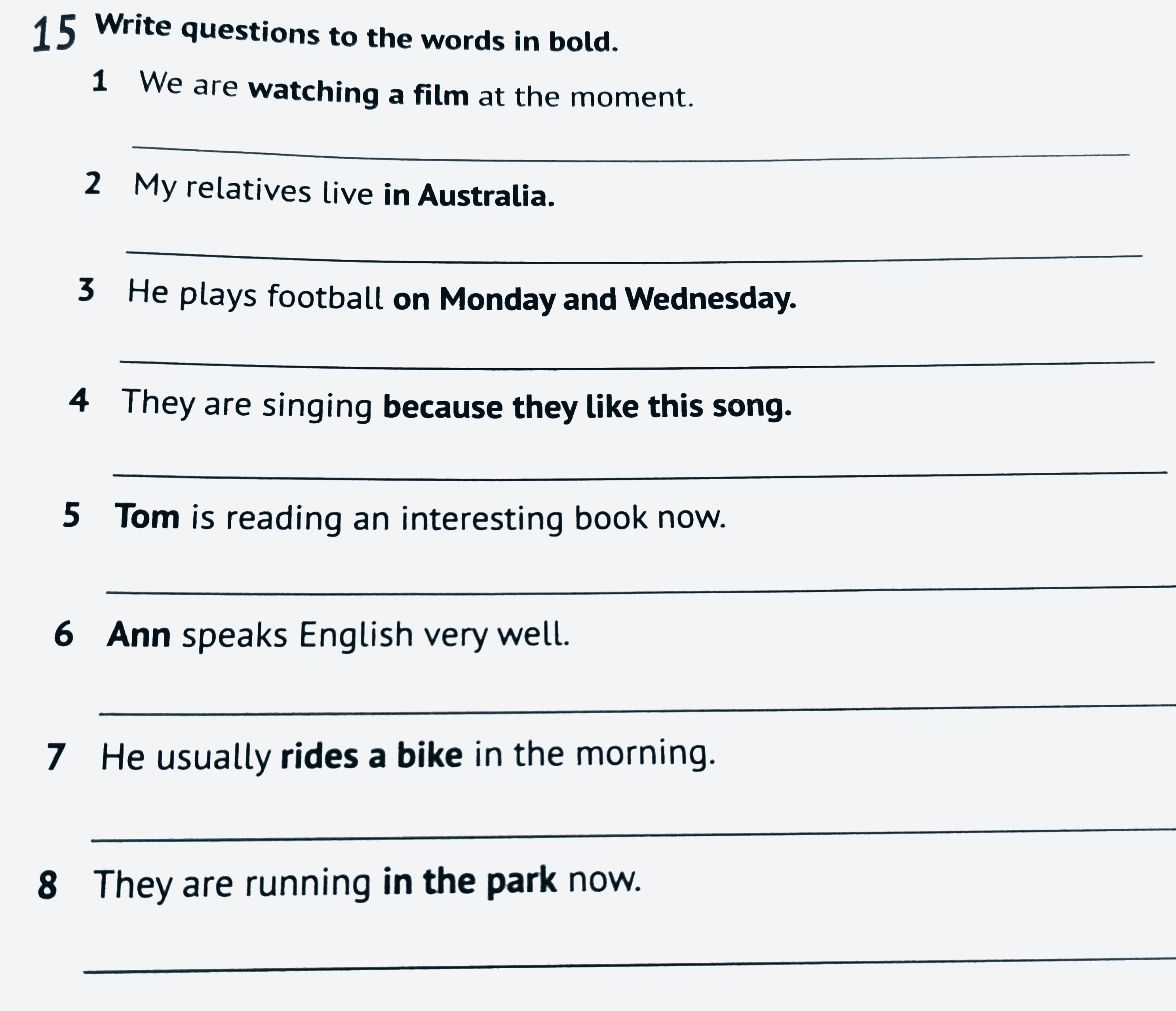 1 what are you doing at the moment? 2 where do your relatives live? 3 when does he play football? 4 why are they singing? 5 who is reading an interesting book now? 6 who speaks english very well? 7 what does he usually do in the morning? 8 what are they doing now