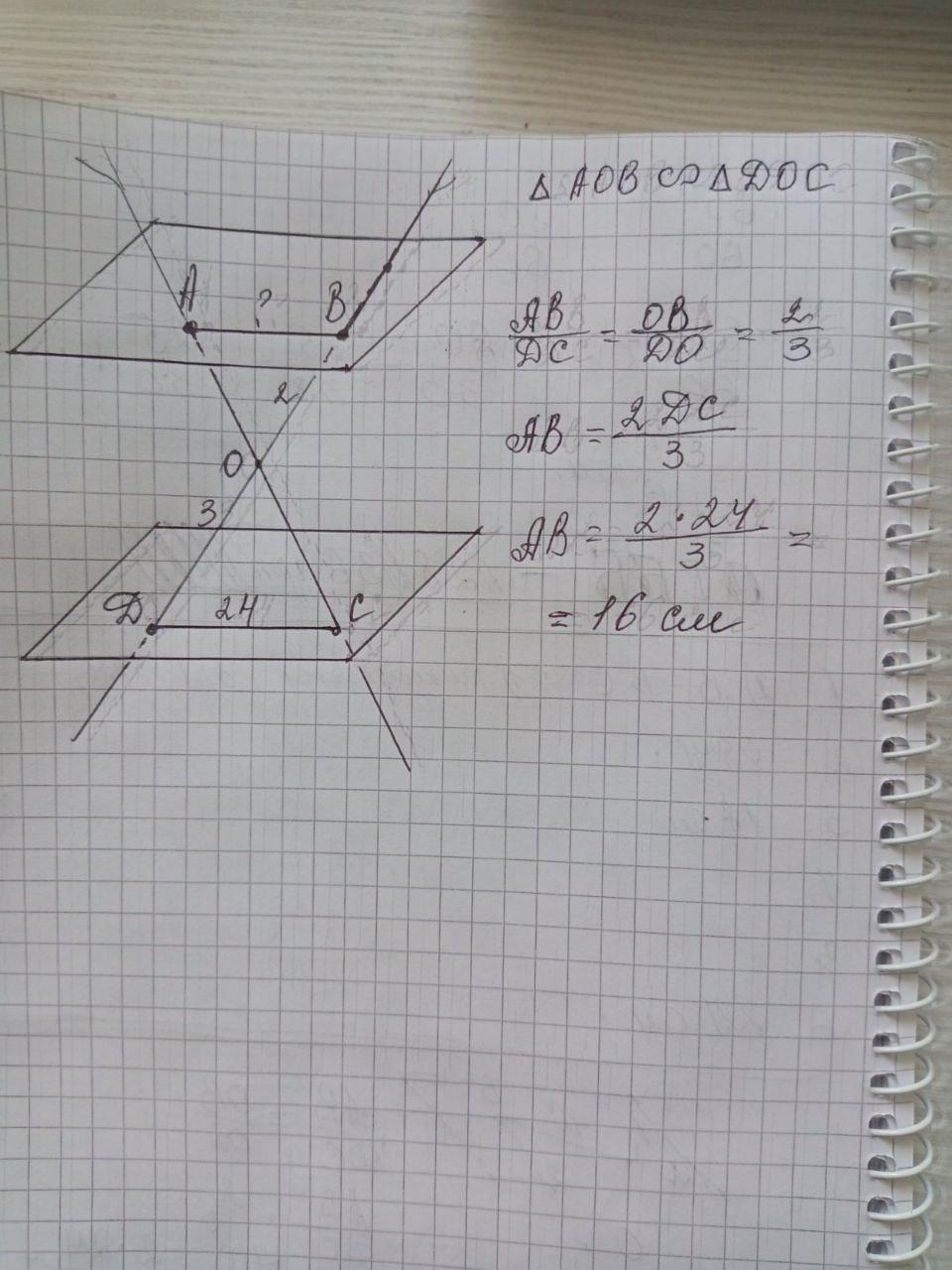 Площини α і ß паралельні. Точки А і В лежать у площині α, а точки C і D – у площині ß. Відрізки AC і BD перетинаються в точці O. Знайди AB, якщо OB:OD = 2:3, DC = 24 см.