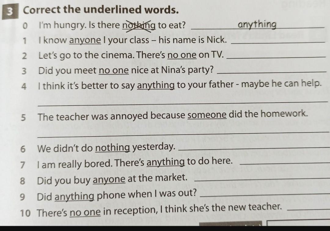 3 Correct the underlined words. 0 I'm hungry. Is there nothing to eat? 1 I know anyone I your class - his name is Nick. 2 Let's go to the cinema. There's no one on TV. Did you meet no one nice at Nina's party? 3 4 I think it's better to say anything to your father - maybe he can help. 5 The teacher was annoyed because someone did the homework. anything 6 We didn't do nothing yesterday. 7 I am really bored. There's anything to do here. Did you buy anyone at the market. Did anything phone when I was out? There's no one in reception, I think she's the new teacher. 8 9 10