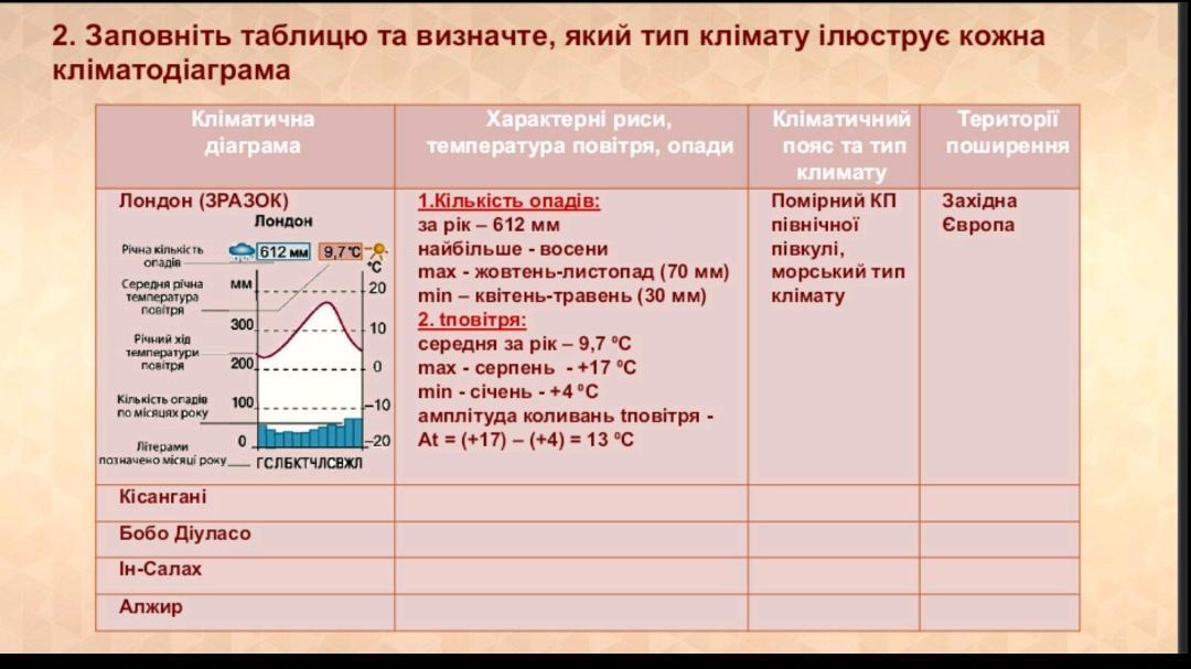 Таким чином, Лондон ілюструє помірний морський клімат, а Бобо Діуласо та Ін-Салах вказують на саванний клімат з великою різницею в температурі та мінімальною кількістю опадів.