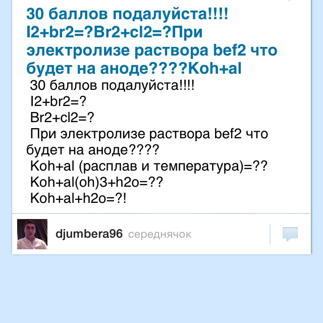 Комментарии: 1) При реакции жидкого брома и газообразного хлора при 0°С получается хлорид брома (I), при реакции в водном растворе получаются бромноватая и соляная кислоты. 2) Бериллий в ряду активности металлов стоит до алюминия, поэтому при элетролизе раствора не выделяется металл. 3) При сплавлении алюминия со щелочью получается алюминат неопределенного состава, собственно как и при реакции в растворе (записаны простейшие варианты).