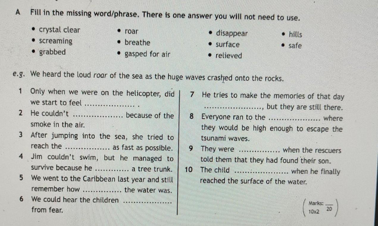 A Fill in the missing word/phrase. There is one answer you will not need to use. • crystal clear • hills • screaming safe • grabbed roar breathe • gasped for air e.g. We heard the loud roar of the sea as the huge waves crashed onto the rocks. 1 Only when we were on the helicopter, did we start to feel 2 He couldn't 3 ..... smoke in the air. After jumping into the sea, she tried to reach the ................. fast as possible. 4 Jim couldn't swim, but he managed to survive because he ............ a tree trunk. We went to the Caribbean last year and still remember how the water was. 5 6 We could hear the children from fear because of the ......….…**** • disappear • surface relieved 7 He tries to make the memories of that day ........., but they are still there. 8 Everyone ran to the ..... where they would be high enough to escape the tsunami waves. 9 They were when the rescuers told them that they had found their son. when he finally 10 The child reached the surface of the water. Marks: