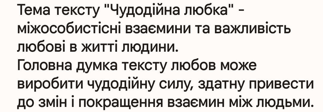 ПОМОГИТЕЕ ПОЖАЛУЙСТА СРОЧНООО!!! ДАМ 50 БАЛОВ!!! ВИЗНАЧТЕ ТЕМУ І ГОЛОВНУ ДУМКУ ТЕКСТУ ЧУДОДІЙНА ЛЮБКА