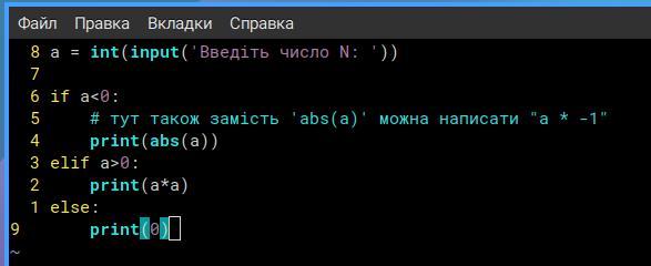 менше за нуль, якщо так - виконуємо те, що після табу (виводимо модуль a. Саме abs робить із a модуль a), якщо перший if не спрацював ми за допомогою elif перевіряємо чи число більше за 0 (a>0), тут так само аналогічно виводимо квадрат a, помноживши його саме на себе. else - спрацьовує, якщо інші 2 випадки не спрацювали і тут ми виводимо 0