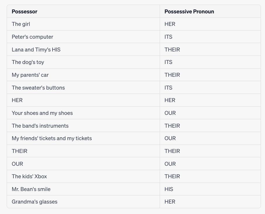 Task 28. Complete the table. The girl's name Peter's computer Lana and Timy's HIS The dog's toy My parents' car The sweater's buttons HER Your shoes and my shoes The band's instruments My friends' tickets and my tickets THEIR OUR The kids' Xbox Mr. Bean's smile Grandma's glasses ITS