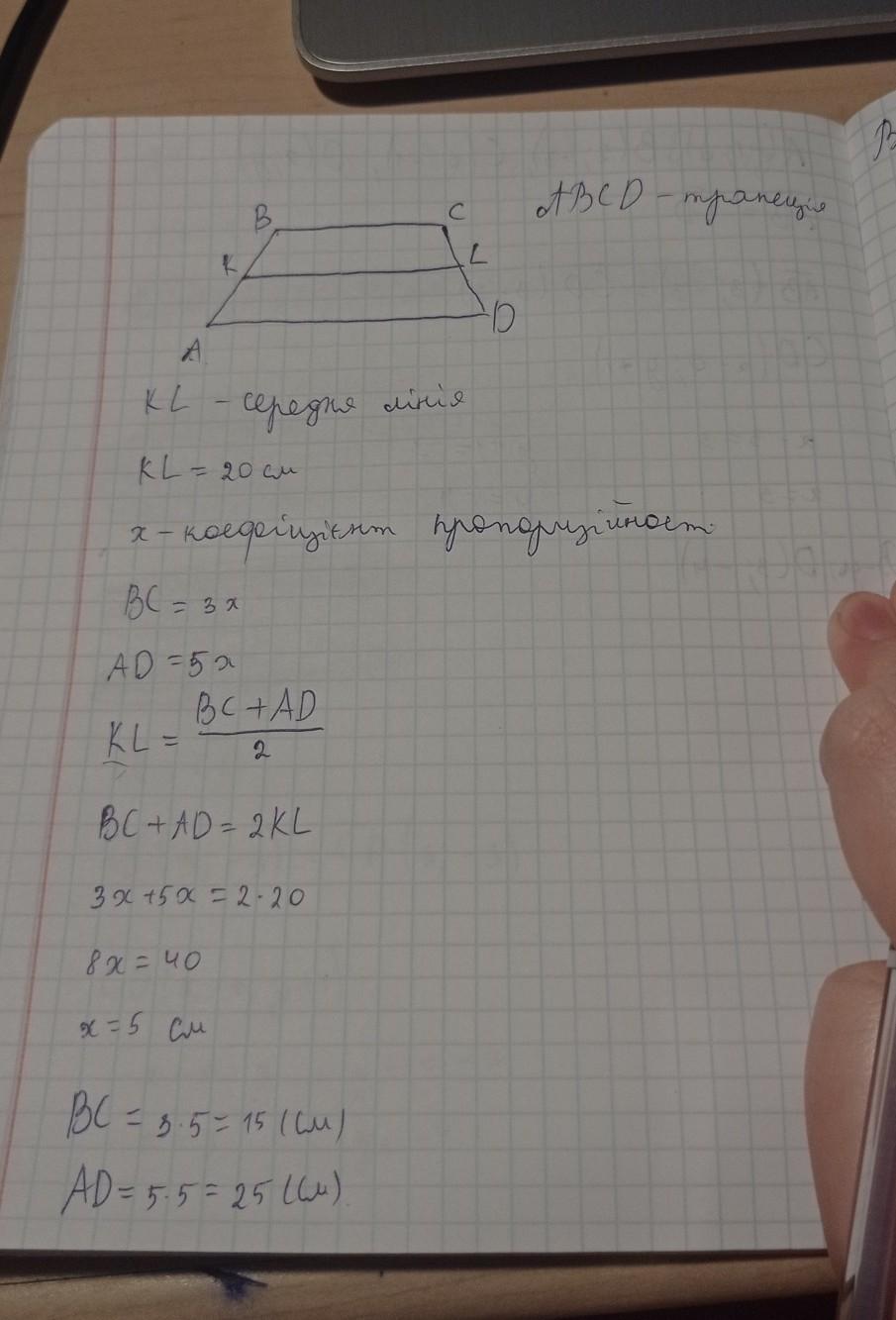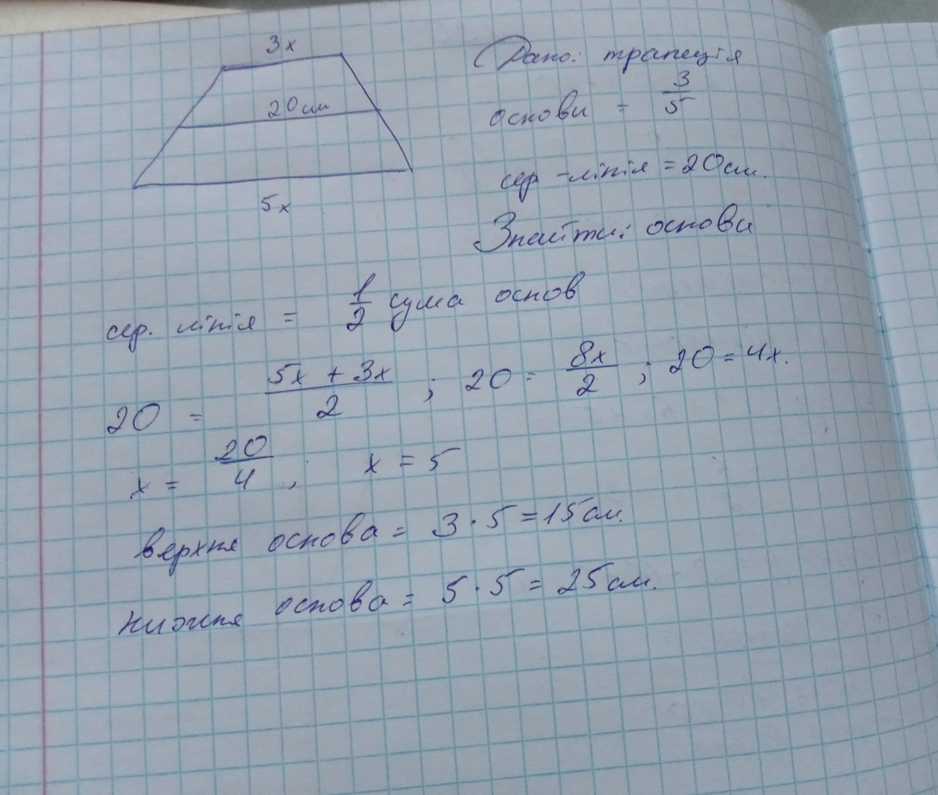 (3б) Знайдіть основи трапеції, якщо вони відносяться як 3 : 5, а середня лінія дорівнює 20 см.