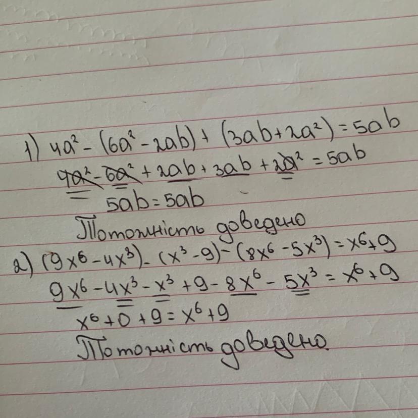 1) 4a² -(6a² - 2ab) + (3ab +2a²) = 5ab;