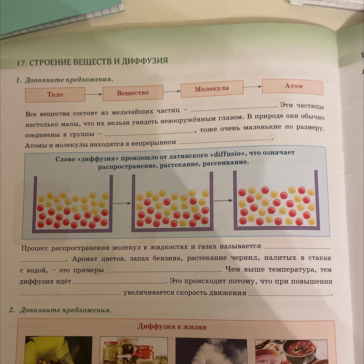 Процесс распространения молекул в жидкостях и газах называется диффузия. Аромат цветов, запах бензина, растекание чернил, налитых в стакан с водой это примеры диффузии. Чем выше температура, тем диффузия идёт быстрее . Это происходит потому, что при повышении температуры увеличивается скорость движения молекул.