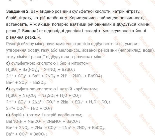 Вам видано розчини сульфатної кислоти, натрій нітрату, натрій карбонату, барій хлориду. Користуючись таблицею розчинності, встановіть, між якими попарно взятими речовинами відбудуться хімічні реакції. Заповніть таблицю, виконайте відповідні досліди і складіть молекулярне та йонні рівняння реакцій.