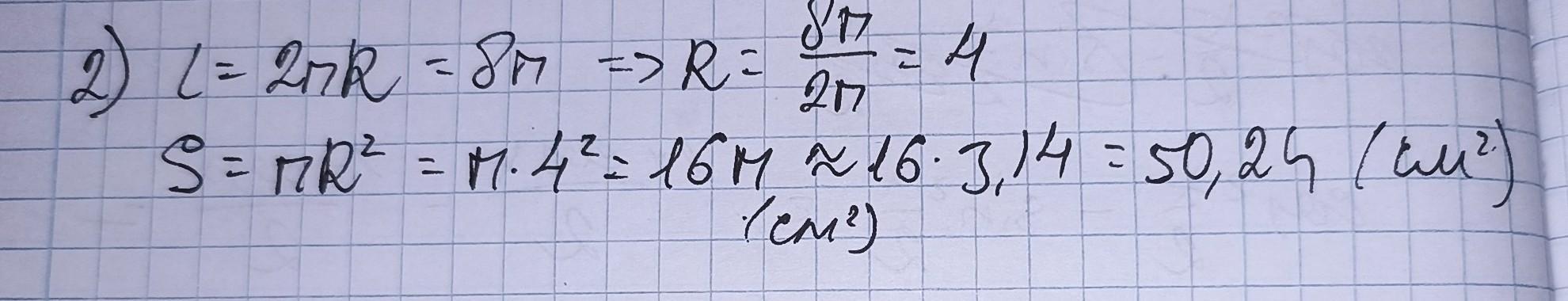 2πR = 8π; R=4 см. S=π*16=16π см²