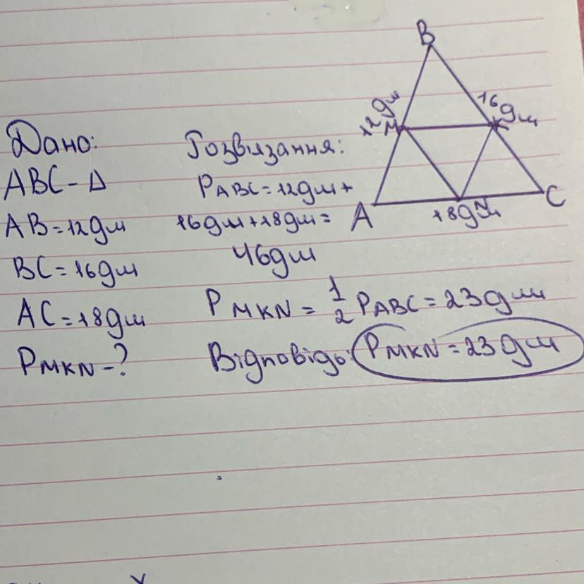 Стороны трикутника дорівнюють 12 дм,16дм і 18 дм знайдіть периметр трикутника,сторонами якого є середні лінії цього трикутника