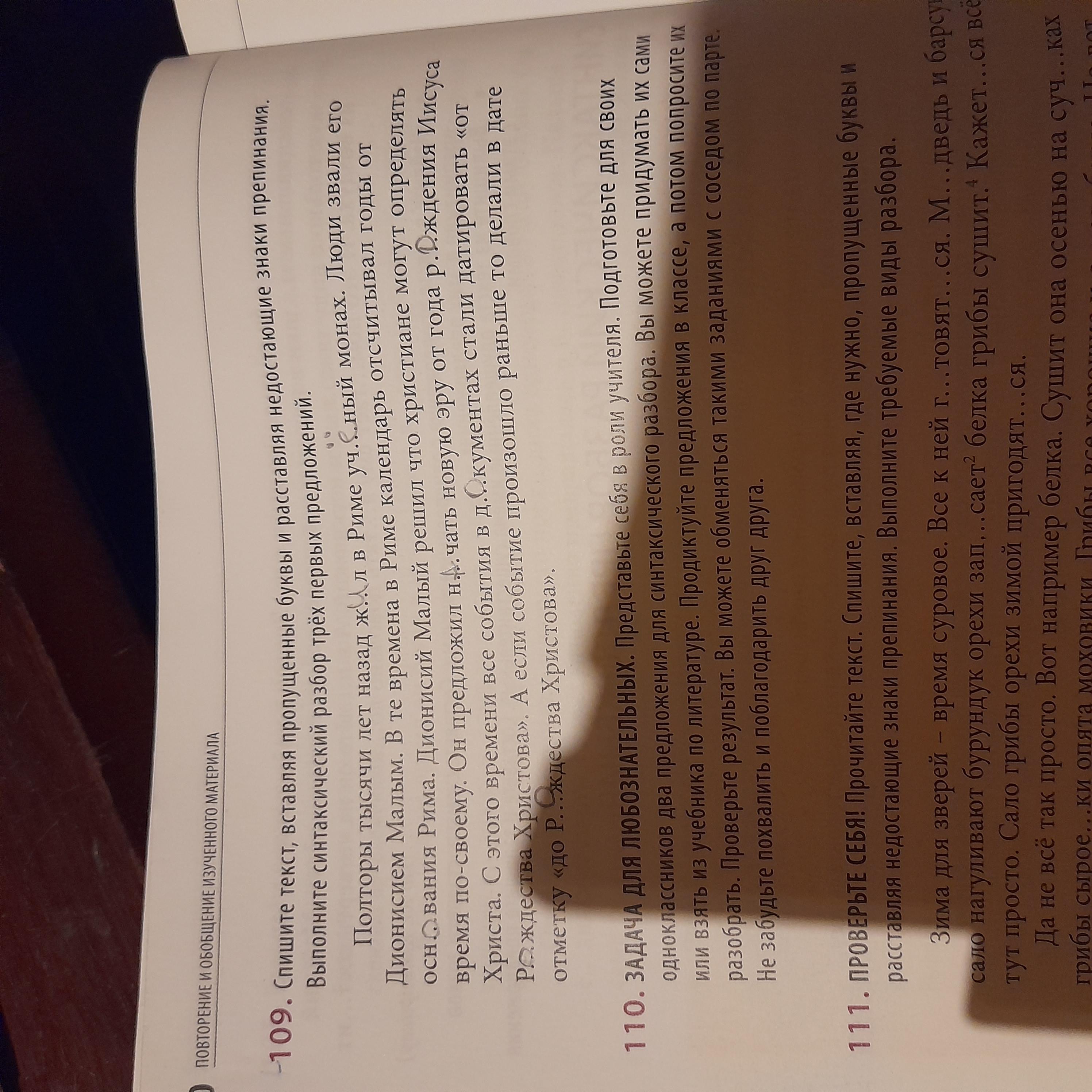 Спишите текст,вставляя пропущенные буквы и расставляя недостающие знаки препинания. Выполните синтаксический разбор трёх первых предложений. Упражнение 109
