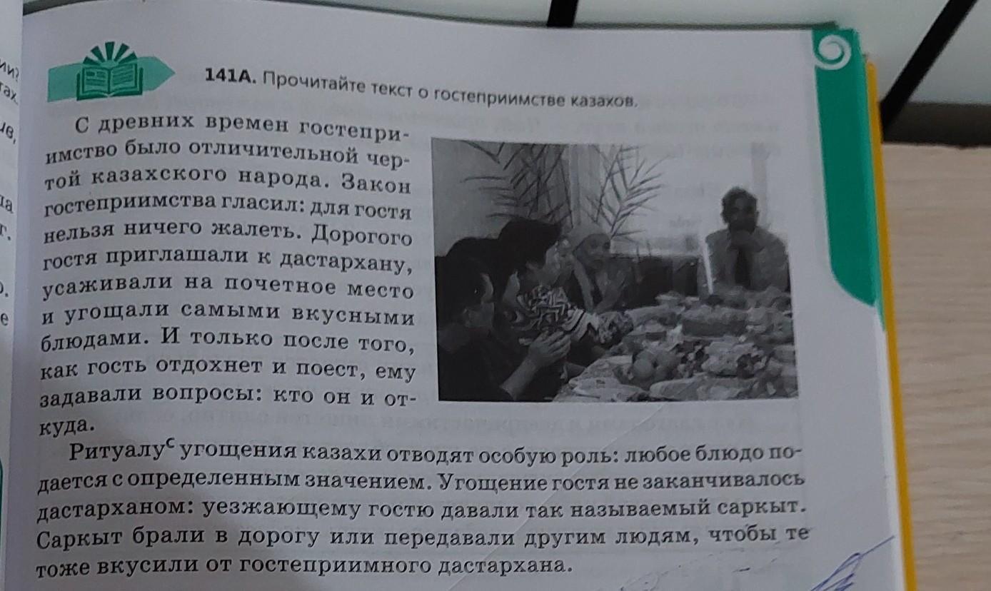 141Б. Почему гостеприимство так важно для казахов? Можно ли пере вести на другие языки слова дастархан, саркым? Если нет, то объясните почему. Как вы относитесь к описанному обычаю? Как образовалось слово гостеприимство?