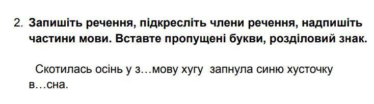 2. Запишіть речення, підкресліть члени речення, надпишіть частини мови. Вставте пропущені букви, розділовий знак. Скотилась осінь у з...мову хугу запнула синю хусточку в...сна.
