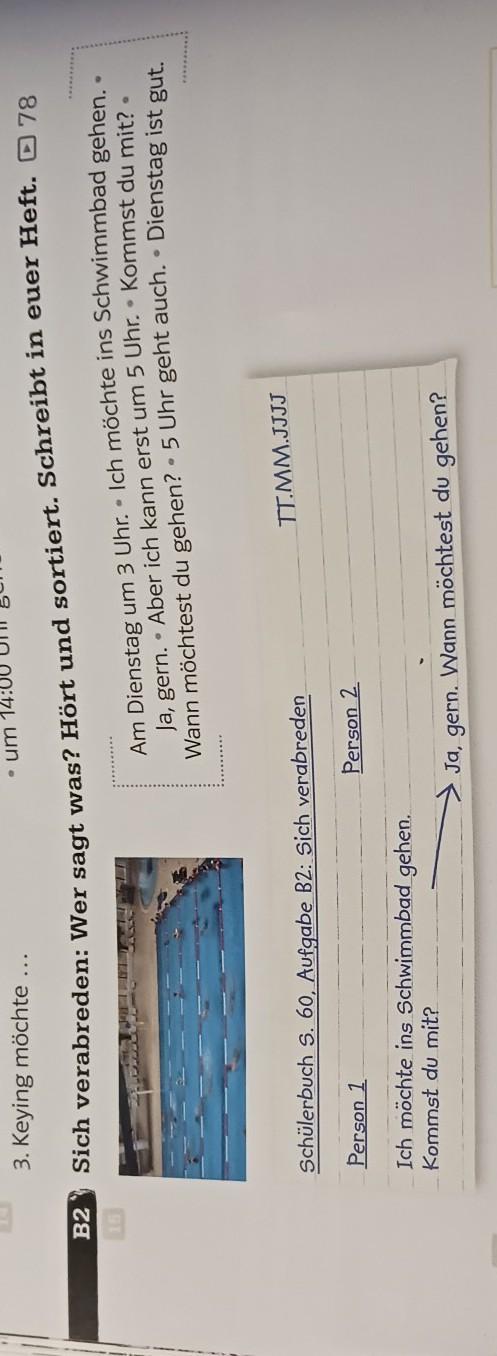 A: Ich möchte ins Schwimmbad gehen. Kommst du mit?
