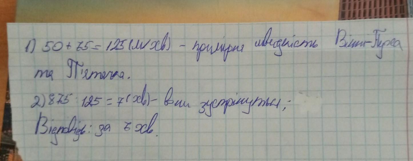 Вінні-Пух та П'ятачок вийшли о 13:00 зі своїх будиночків назустріч один одному. Вінні-Пух йшов зі швидкістю 75 м/хв, а П'ятачок-зі швидкістю 50м/хв.Через який час вони зустрінуться, якщо відстань між їхніми будиночками 875 м?