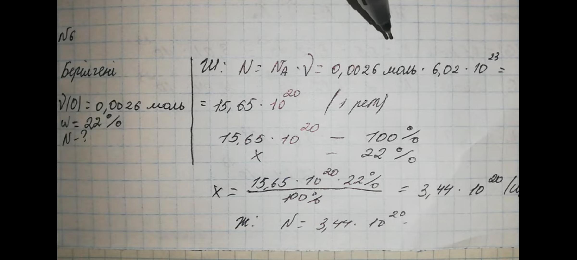 •6. Тыныштықта бір рет тыныстаған жасөспірімнің өкпесiне шамамен 300 мл (онда 0,0026 моль оттек бар) ауа кiредi. Осы оттектiң 22%-ы екпеге сiңiрiлiп, қалғаны сыртка шығады. Бiр рет тыныстағанда жасөспiрiм канша молекула оттект жұтады? Неше молекула оттек екпеге сiңiрiлмейдi? Жауабы: 3,44×10 21