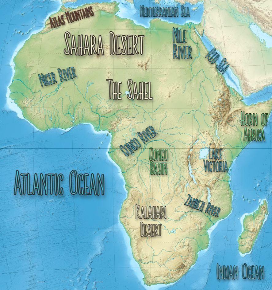 - Річки: Конго, Замбезі, Оранжева, Ніл.