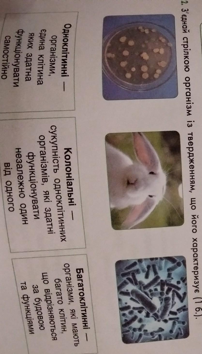 2. З'єднай стрілкою організм iз твердженням, що його характеризуе (1 6.). Одноклітинні організми, едина клітина яких здатна функціонувати самостійно Колоніальні - сукупність одноклітинних організмів, які здатнi функціонувати незалежно один від одного Багатоклітинні організми, які мають багато клітин, що відрізняються за будовою та функціями wy