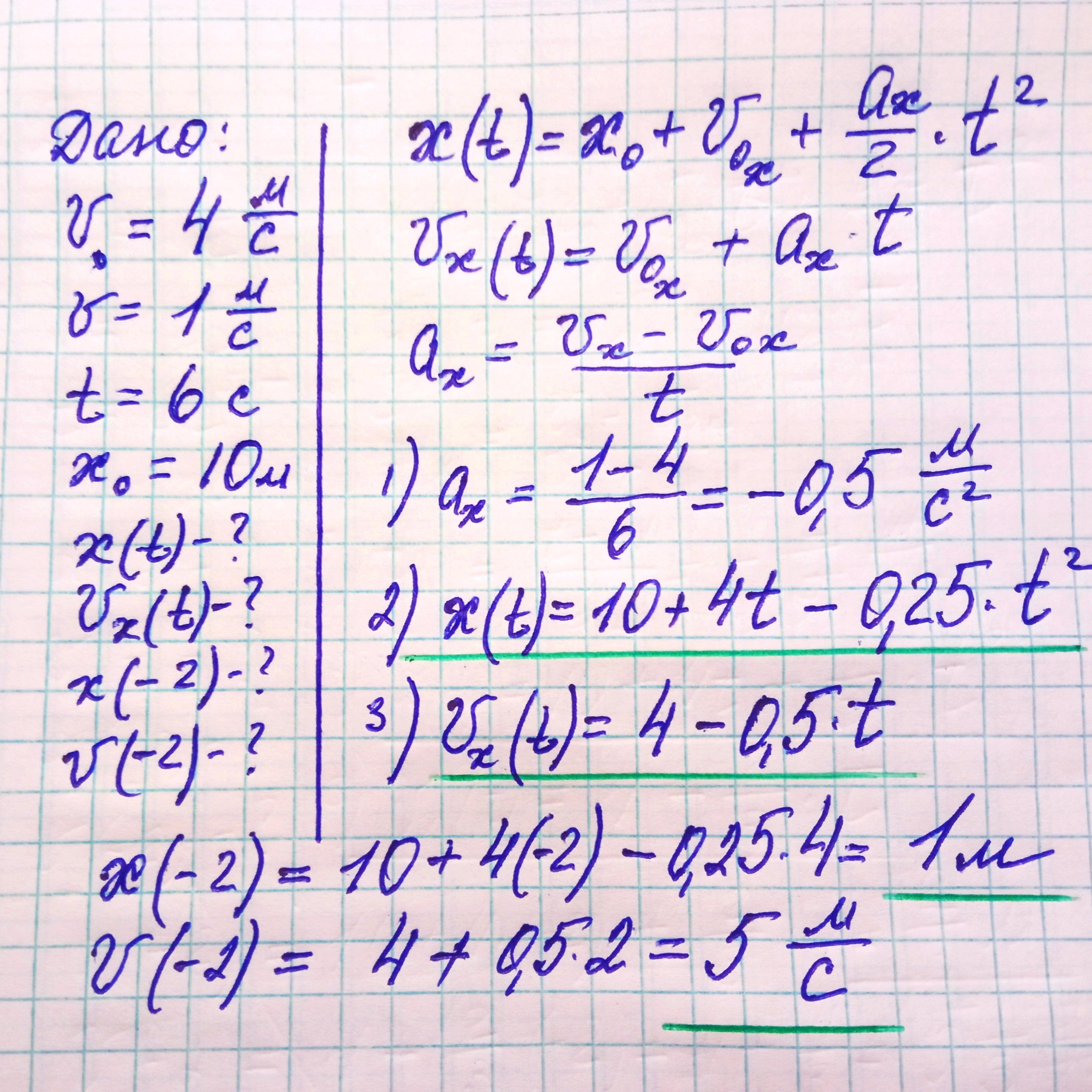 По графику зависимости скорости от времени определите проекцию ускорения тела, запишите уравнения скорости и перемещения тела. Определите координату тела и его скорость за 2 с до начала наблюдения. Положение тела на начало наблюдения соответствует координате 10 м.