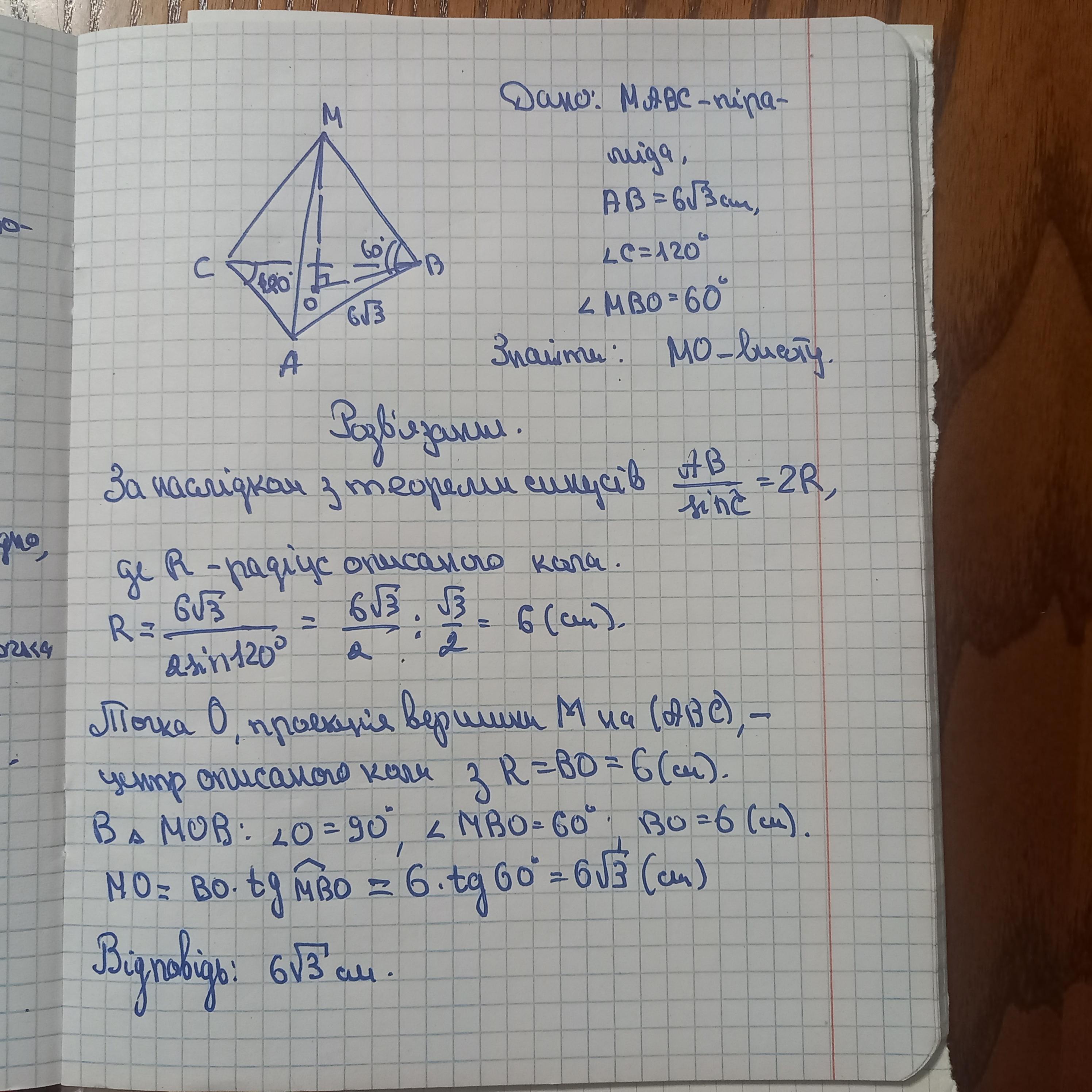 40 баллов!!!! Усі бічні ребра піраміди нахилені до площини основи під кутом 60⁰. Знайдіть висоту піраміди, якщо її основою є трикутник ABC, у якому AB= 6√3 см, кут С=120⁰