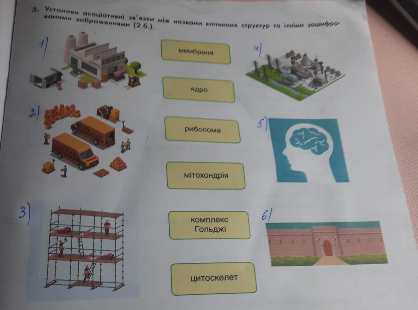 3. Установи асоціативні зв'язки між назвами клітинних структур та їхніми зашифро- ваними зображеннями (2 б.). мембрана ядро рибосома мітохондрія Комплекс Гольджі цитоскелет
