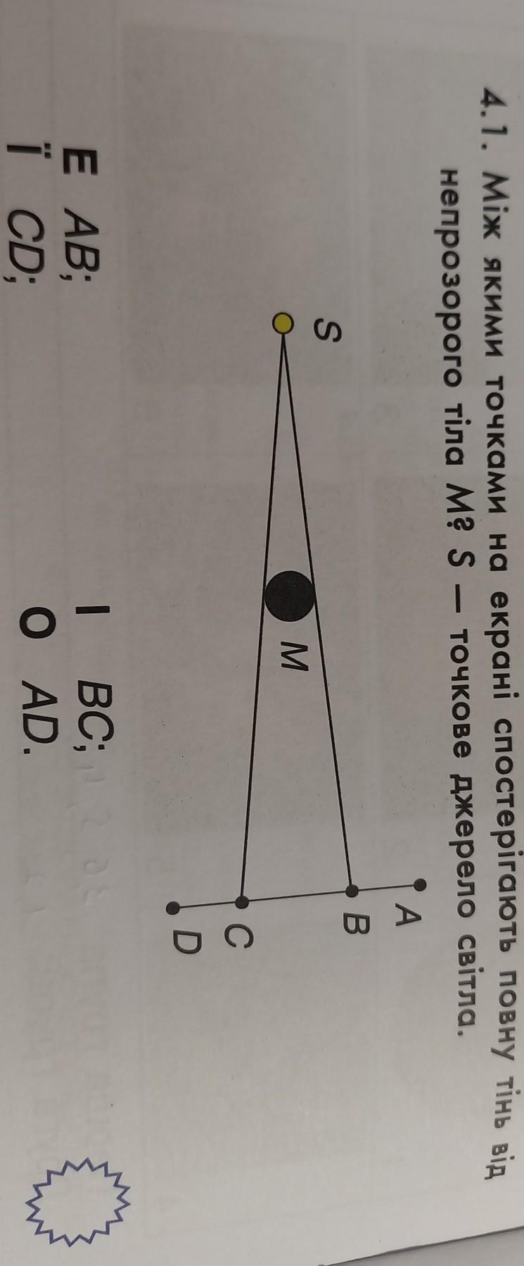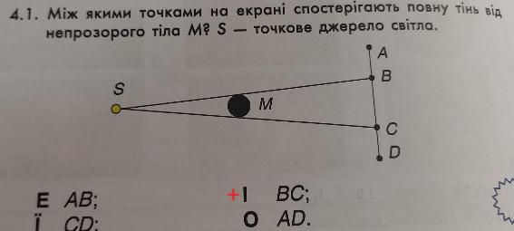 4.1. Мiж якими точками на екрані спостерігають повну тiнь вiд непрозорого тіла М? S. точкове джерело світла. E AB; Ї CD; S M 1 BC; O AD. 4 A в с D