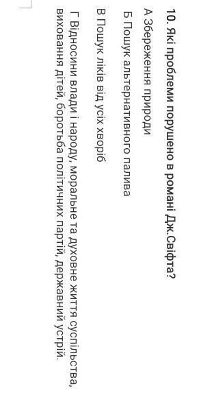 10. Які проблеми порушено в романі Дж.Свіфта? А Збереження природи Б Пошук альтернативного палива в Пошук ліків від усіх хворіб Г Відносини влади і народу, моральне та духовне життя суспільства, виховання дітей, боротьба політичних партій, державний устрій.