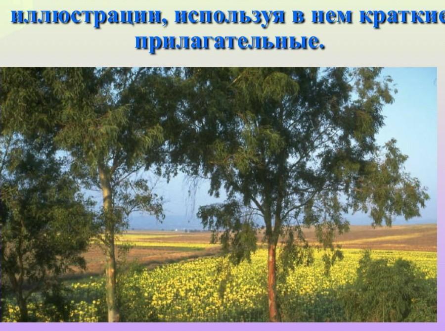Зеленые деревья , большое поле, жёлтые цветы, высокие ели (?) Зелёная листва, дальная местность