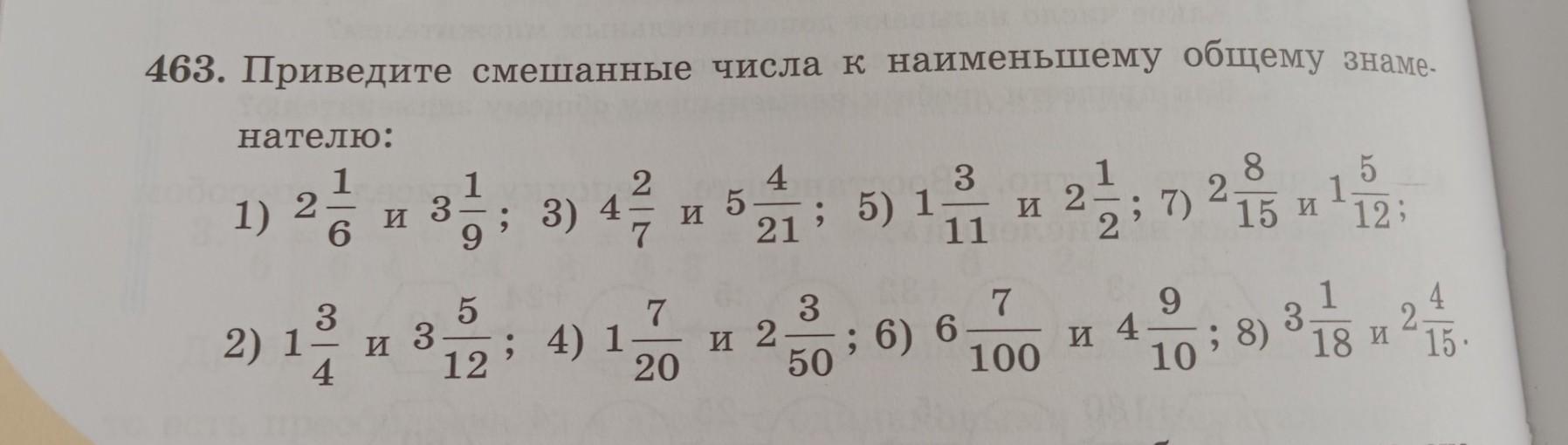 Ответ:1) 2 целые и3 /18 и 3 целые и 2\18 3)4 целых 6/21 и 5 4/21 5) 1 целая и 6 \22 и 2 11/22 7) 2 32/60 И 1 25/60 2) 1 9/12 и 3 5/12 4)1 35 /100 и 2 6/100 6) 6 7 /100 и 4 90 /100 8) 3 5 /90 и 2 24 /90
