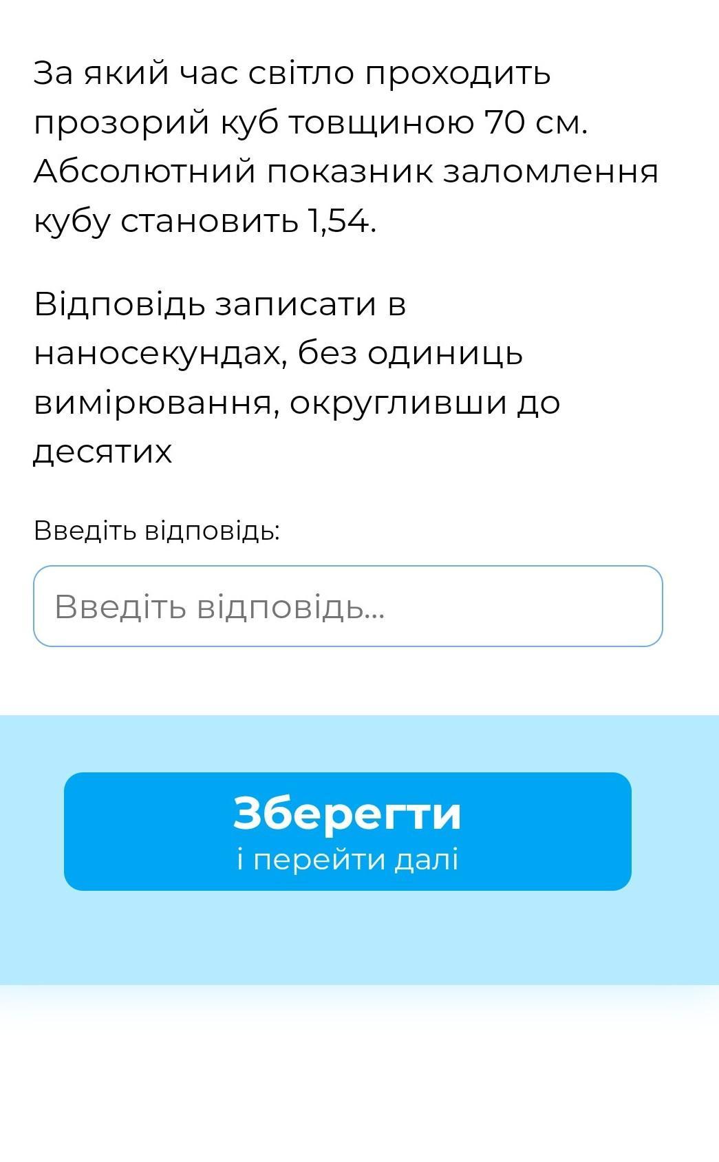 2/9 24:20 За який час світло проходить прозорий куб товщиною 70 см. Абсолютний показник заломлення кубу становить 1,54. Відповідь записати в наносекундах, без одиниць вимірювання, округливши до десятих