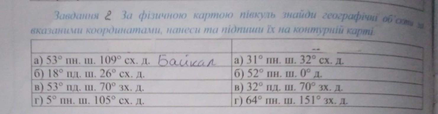 Завдання 2 За фізичною картою півкуль знайди географічні об'скими за вказаними координатами, нанеси та підпиши їх на контурній карті Байкал a) 53° пн. ш. 109° сх. д. б) 18° пд. ш. 26° сх. д. B) 53° пд. ш. 70° зх. д. г) 5° пн. ш. 105° сх. д. a) 31° пн. ш. 32° сх. д. б) 52° пн. ш. 0° д. B) 32° пд. ш. 70° зх. д. г) 64° пн. ш. 151° зх. д.
