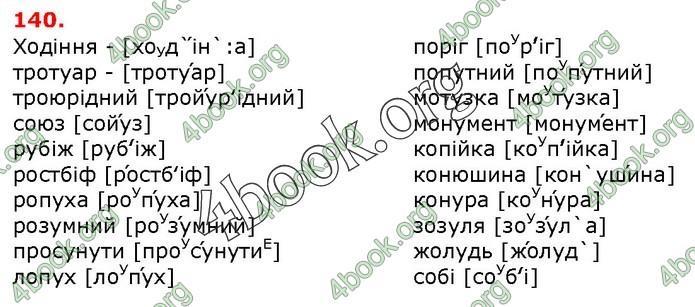140 Вимовте слова. Простежте, коли [о] наближається до [у], а коли [о] більш закритий. Запишіть слова фонетичною транскрипцією. Ходіння, тротуар, троюрідний, союз, рубіж, ростбіф, ро- пуха, розумний, просунути, лопух, поріг, попутний, мотузка, монумент, копійка, конюшина, конура, зозуля, жолудь, собі.