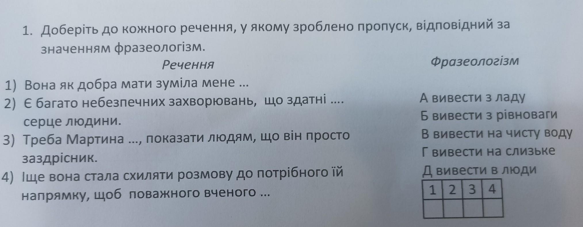 доберіть до кожного речення, у якому зроблено пропуск, відповідний за значенням фразеологізмів