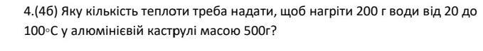 Яку кількість теплоти треба надати, щоб нагріти 200 г води від 20° до 100ºС у алюмінієвій каструлі масою 500г?