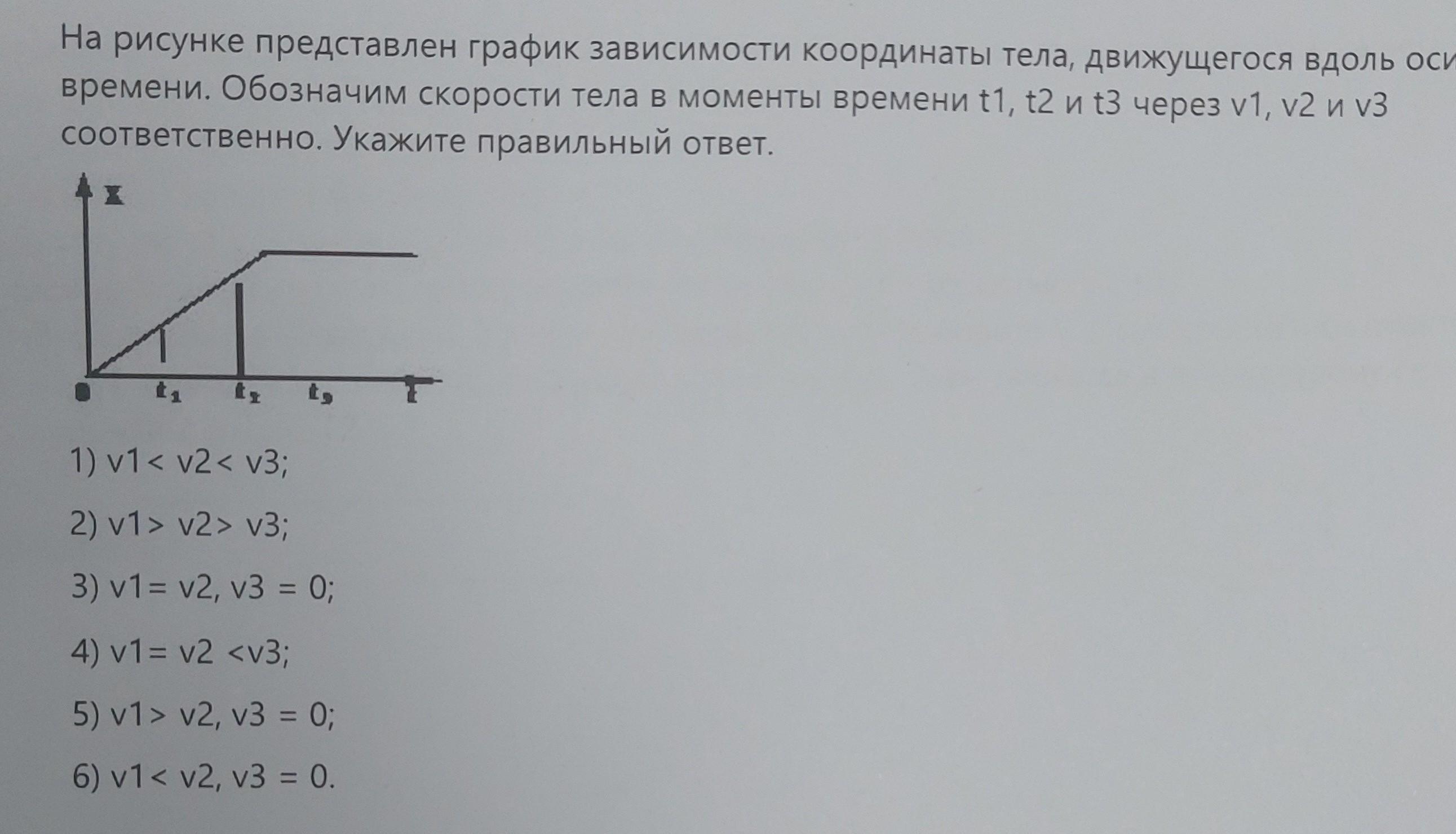 На рисунке представлен график зависимости координаты тела, движущегося вдоль оси ОX, от времени. Обозначим скорости тела в моменты времени t1, t2 и t3 через v1, v2 и v3 соответственно. Укажите правильный ответ. t1 C tந 1) v1< v2< v3; 2) v1> v2> v3; 3) v1= v2, v3 = 0; 4) v1= v2 v2, v3 = 0; 6) v1< v2, v3 = 0.