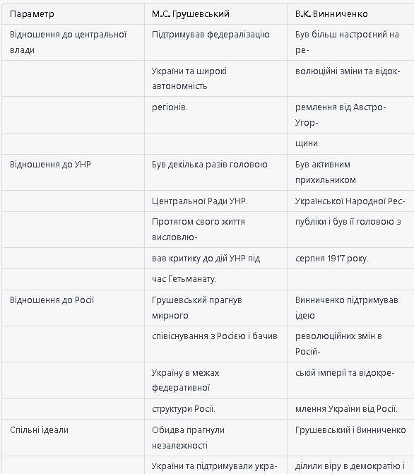 Михайло Сергієвич Грушевський і Володимир Кирилович Винниченко були видатними діячами української політичної сцени на початку 20 століття, і вони мали різні погляди на події, які відбувалися в Україні під час 1917-1919 років. Нижче наведено порівняльну таблицю, що відображає як спільні, так і відмінні риси їхніх політичних поглядів і дій:
