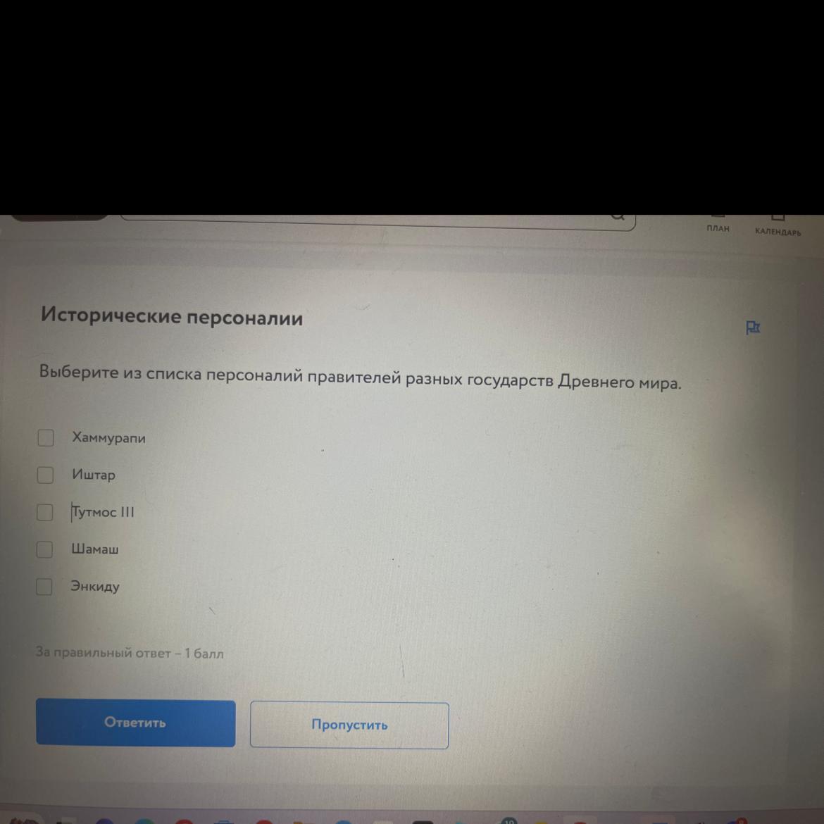 Хаммурапи и Тутмос III были древними правителями различных государств в Древнем мире. Остальные имена из списка, такие как Иштар, Шамаш и Энкиду, связаны с древними мифами и богами, а не правителями.