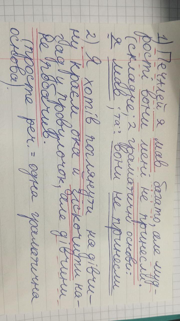 Поставте розділові знаки. Підкресліть граматичні основи. Запишіть відповідно в дужках: 1) просте речення; 2) складне речення. Печалей (я) ((мав) багато, але мудрості (вони) мені ((не принесли)). (2) складне речення) (Я) ((хотів поглянути)) на дівчину краєм ока й ((зіскочити)) назад у провулочок, але дівчини ((не побачив)). (1) просте речення)