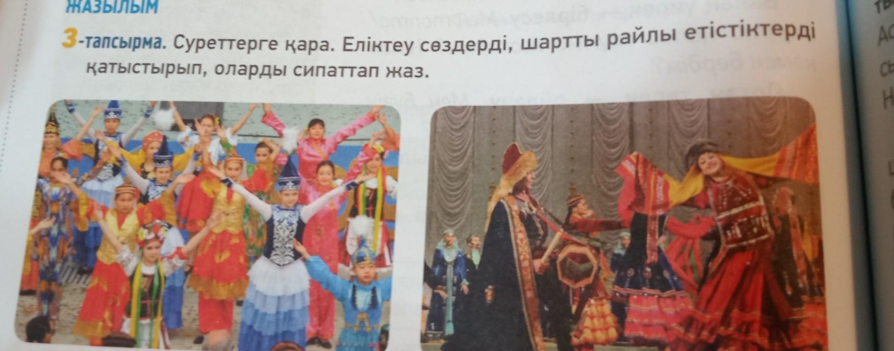 ЖАЗЫЛЫМ 3-тапсырма. Суреттерге қара. Еліктеу сөздерді, шартты райлы етістіктерді қатыстырып, оларды сипаттап жаз.