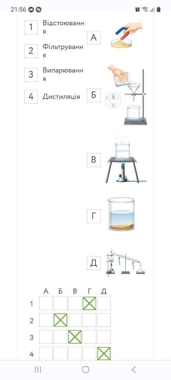 Установіть відповідність між способом розділення суміші (1-4) та малюнком, який ілюструє цей спосіб (А-Д).