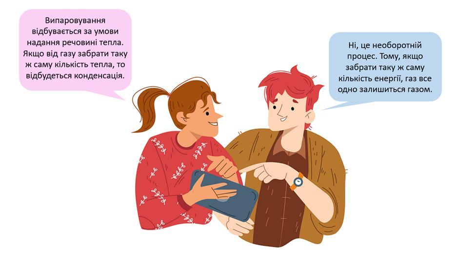 Марійка має рацію. Випаровування (процес пароутворення) відбувається за умови надання речовині тепла. І знову ж таки, якщо від газу забрати таку ж саму кількість тепла, то відбудеться конденсація, тобто зміна газуватого стану речовини на рідкий, оскільки це зворотній процес.