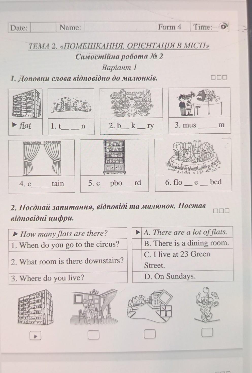 1. town, 2. bakery, 3. museum, 4. curtain, 5. capborb, 6. flower bed