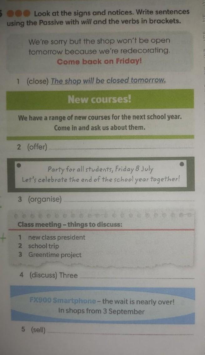 Look at the signs and notices. Write sentences using the Passive with will and the verbs in brackets.