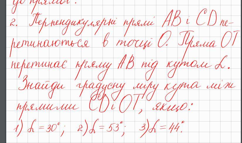 Кут між прямою AB і прямою OT дорівнює 44 градуси. Тоді кут між прямою CD і OT буде: 90° - 44° = 46°.