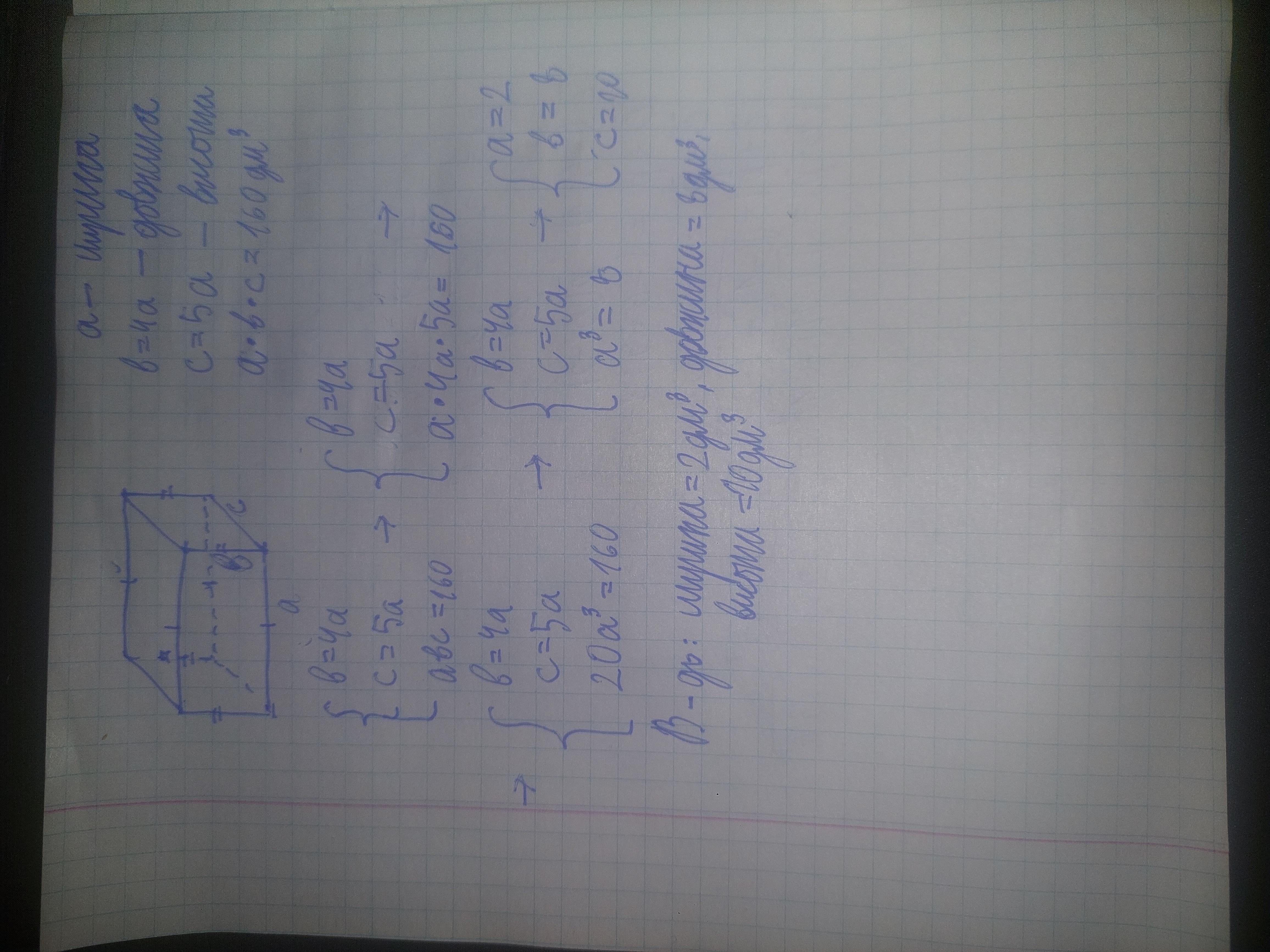 У прямокутному паралелепіпеді довжина в 4 рази(ів) бiльша від ширини, а висота в 5 рази(ів) бiльша від ширини. Знайди розмiри прямокутного паралелепіпеда, якщо його об'єм дорівнює 160 дм3. дам 30 баллов