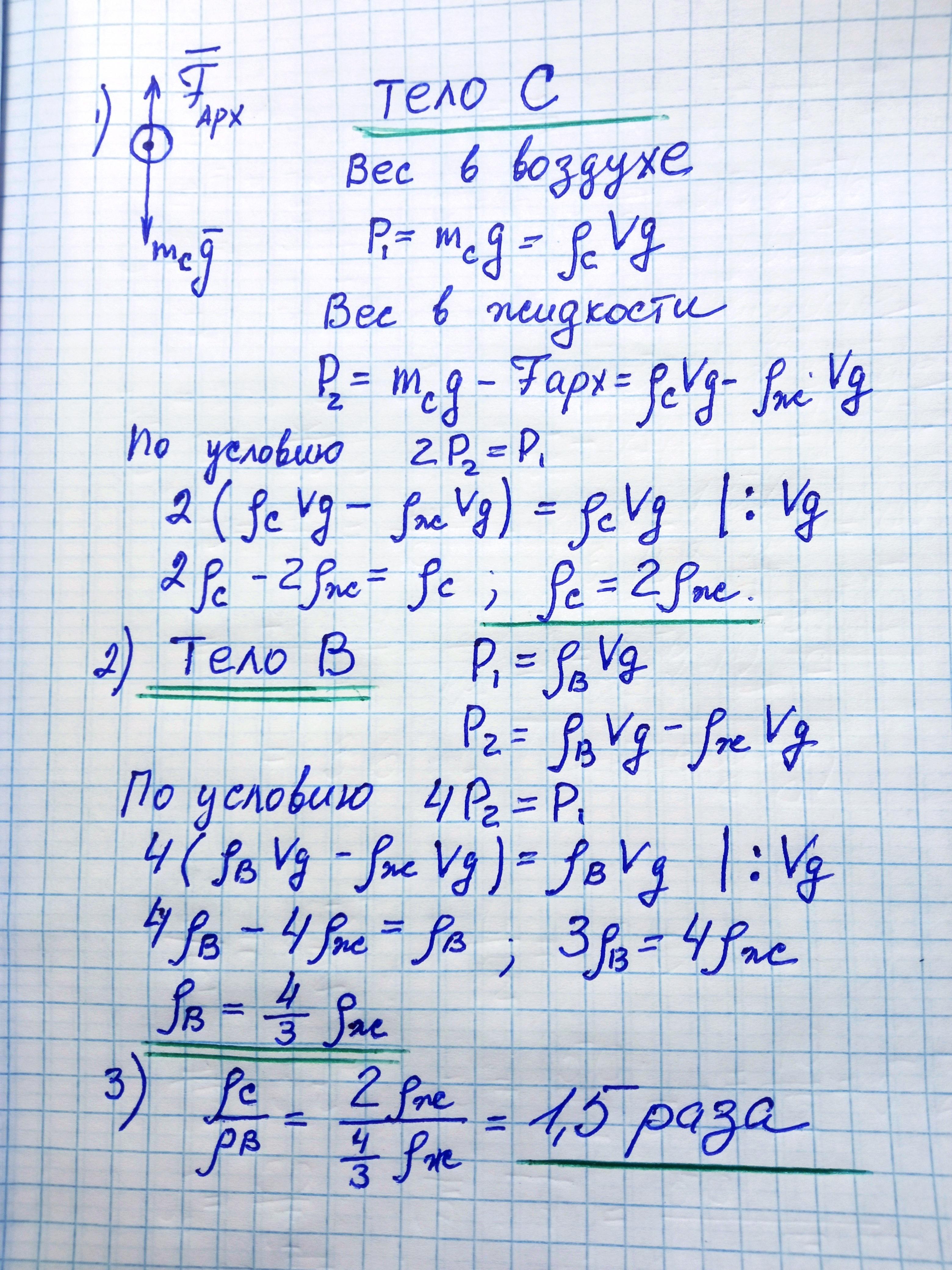 Задние № 3. Вес тела С в жидкости в 2 раза меньше чем в воздухе, вес тела В в жидкости в 4 раза меньше чем в воздухе. Во сколько раз плотность тела С больше плотности тела В?
